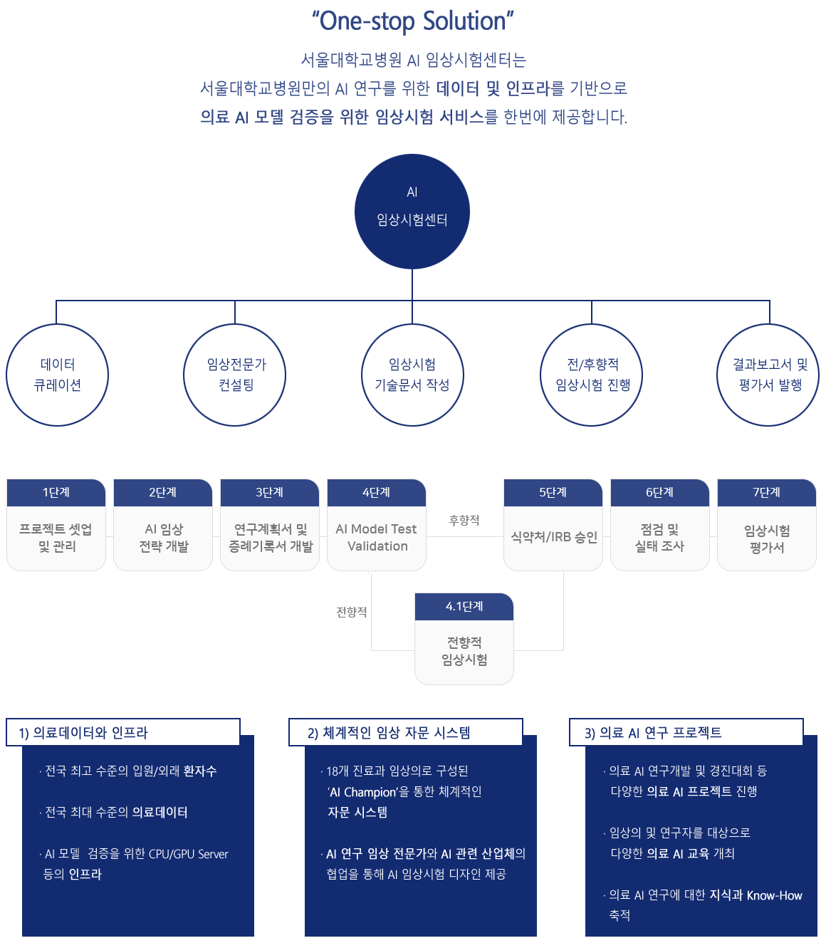 진료 과정에서 적용가능한 임상 AI 모델 인증 기술 개발을 목표로 AI 임상시험센터 인증 프로세스 절차를 개발하고, 임상 데이터 구축, AI 모델 임상 시험 수행 서비스를 제공합니다.