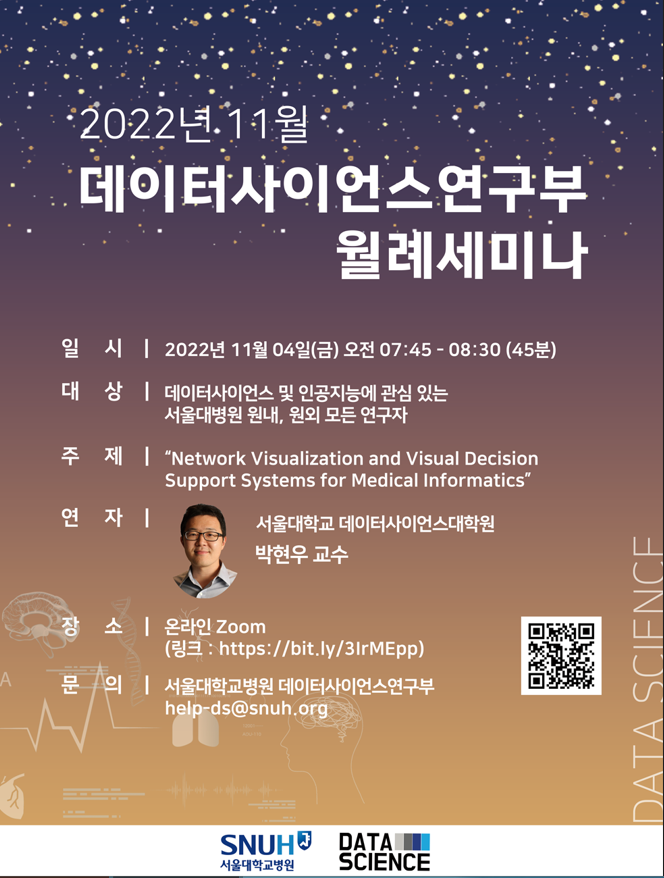 서울대학교병원 혁신의료기술연구소 데이터사이언스 연구부에서 오는 11월 4일 아래와 같이 월레세미나를 진행하오니 많은 관심과 참여 부탁드립니다. ![]() |