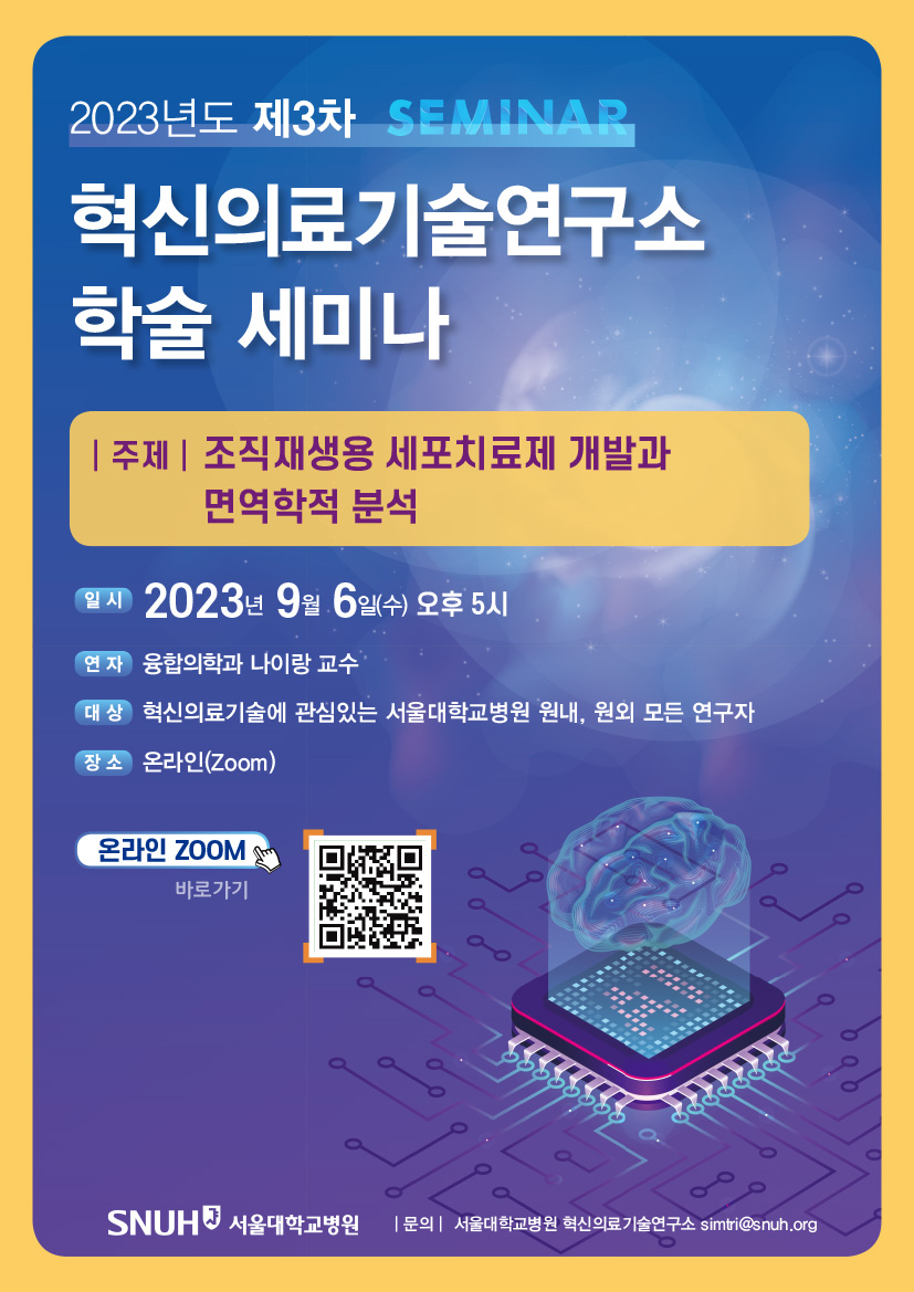 혁신의료기술연구소에서는 연구소 내 연구자들이 진행하는 연구에 대한 발표 및 질의응답을 통해 정보를 공유하는 시간을 갖고자 합니다. 혁신의료기술에 관심있는 분들의 많은 참여 부탁드립니다. 2023년 제3차 혁신의료기술연구소 학술 세미나- 일시: 2023년 9월 6일(수) 17시 - 연자: 융합의학과 나이랑 교수 - 주제: 조직재생용 세포치료제 개발과 면역학적 분석 - 장소: 온라인(ZOOM) 링크: http://bit.ly/SIMTRI_Seminar01