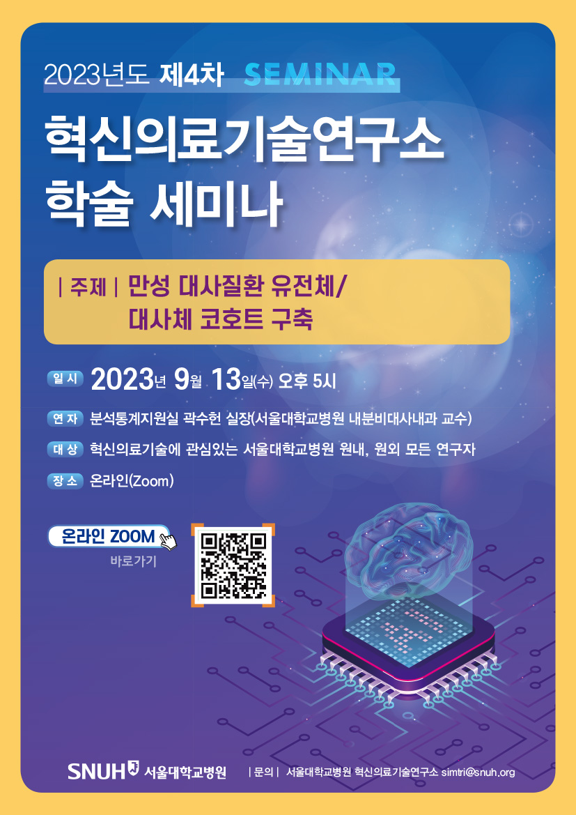 혁신의료기술연구소에서는 연구소 내 연구자들이 진행하는 연구에 대한 발표 및 질의응답을 통해 정보를 공유하는 시간을 갖고자 합니다. 혁신의료기술에 관심있는 분들의 많은 참여 부탁드립니다. 2023년 제4차 혁신의료기술연구소 학술 세미나- 일시: 2023년 9월 13일(수) 17시 - 연자: 분석통계지원실 곽수헌 실장(내분비대사내과 교수) - 주제: 만성 대사질환 유전체/대사체 코호트 구축 - 장소: 온라인(ZOOM) 링크: http://bit.ly/SIMTRI_Seminar01