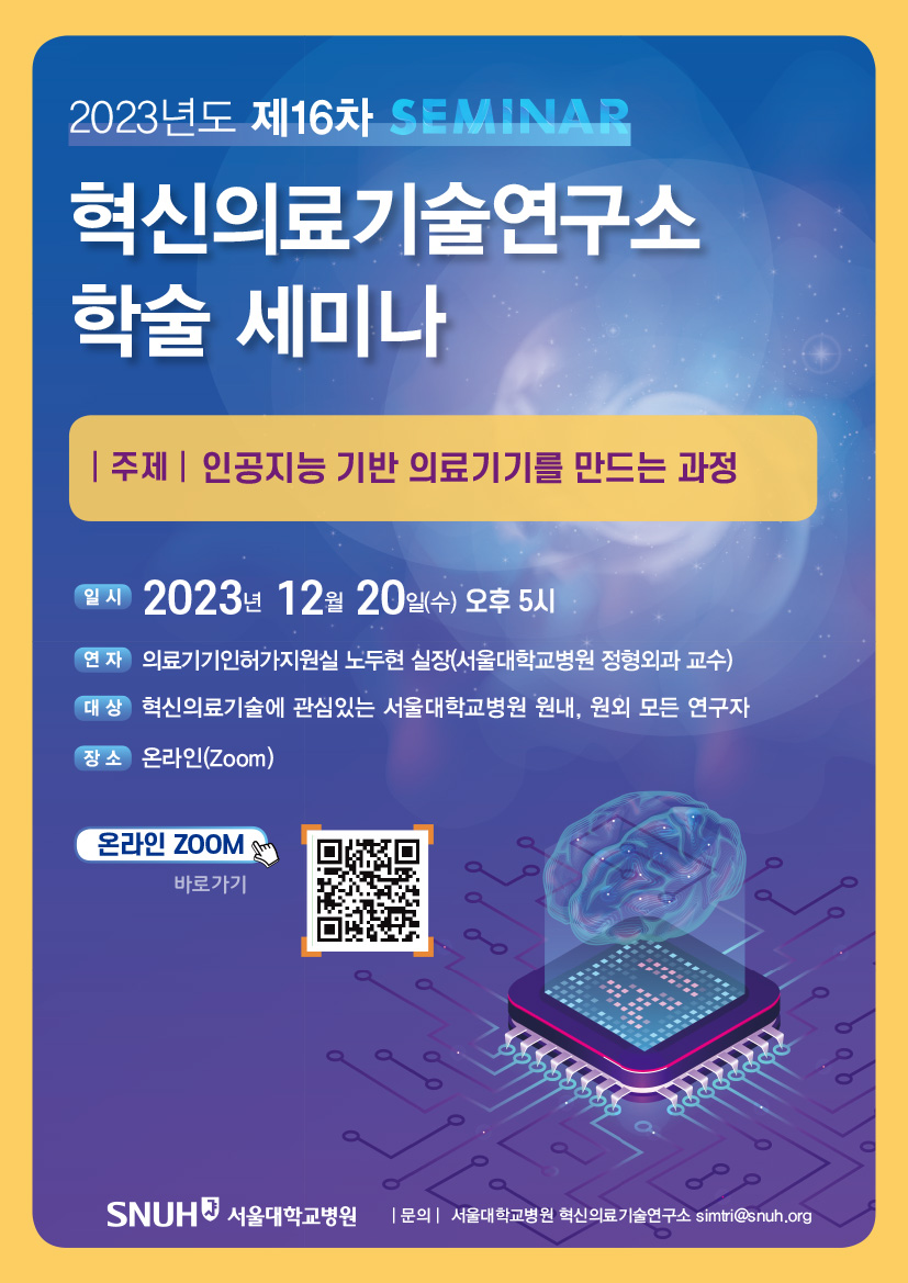 혁신의료기술에 관심 있는 분들의 많은 참여 부탁드립니다. 2023년 제16차 혁신의료기술연구소 학술 세미나- 일시: 2023년 12월 20일(수) 17시 - 연자: 의료기기인허가지원실 노두현 실장(서울대학교병원 정형외과 교수) - 주제: 인공지능 기반 의료기기를 만드는 과정 - 장소: 온라인(ZOOM) 링크: http://bit.ly/SIMTRI_Seminar01 |