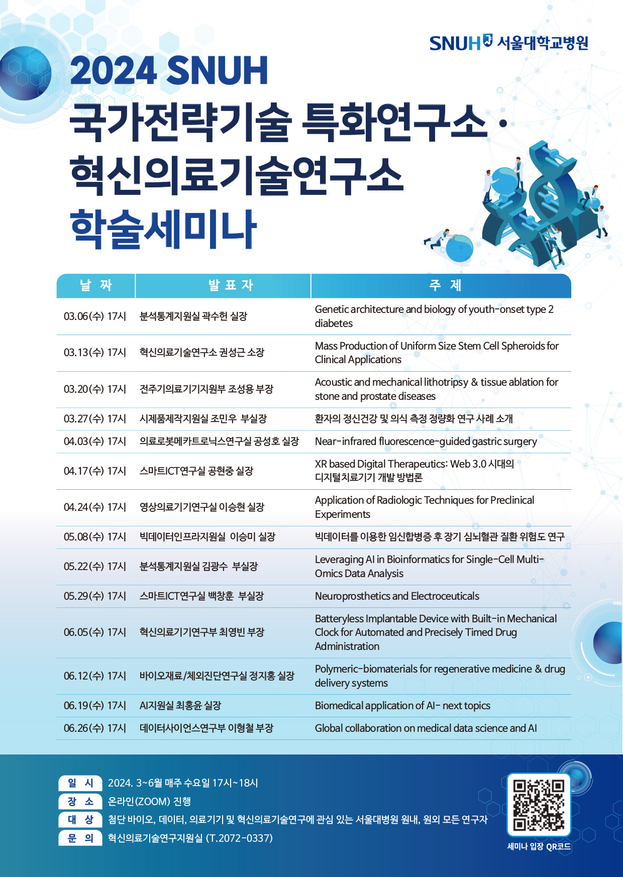 2024년 SNUH 국가전략기술특화연구소-혁신의료기술연구소 학술세미나일시: 2024년 3월~6월 매주 수요일 17시~18시 장소: 온라인(Zoom) 대상: 첨단 바이오, 데이터, 의료기기 및 혁신의료기술연구에 관심 있는 원내/외 모든 연구자 문의: 혁신의료기술연구지원실(tel.2072-0337)