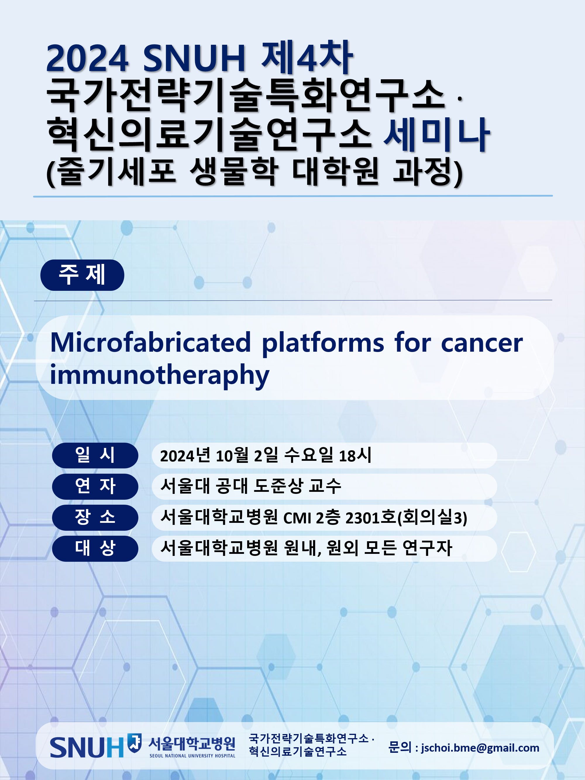 2024 SNUH 제4차 국가전략기술특화연구소-혁신의료기술연구소 세미나를 다음과 같이 안내드립니다. - 주제: Microfabricated platforms for cancer immunotheraphy