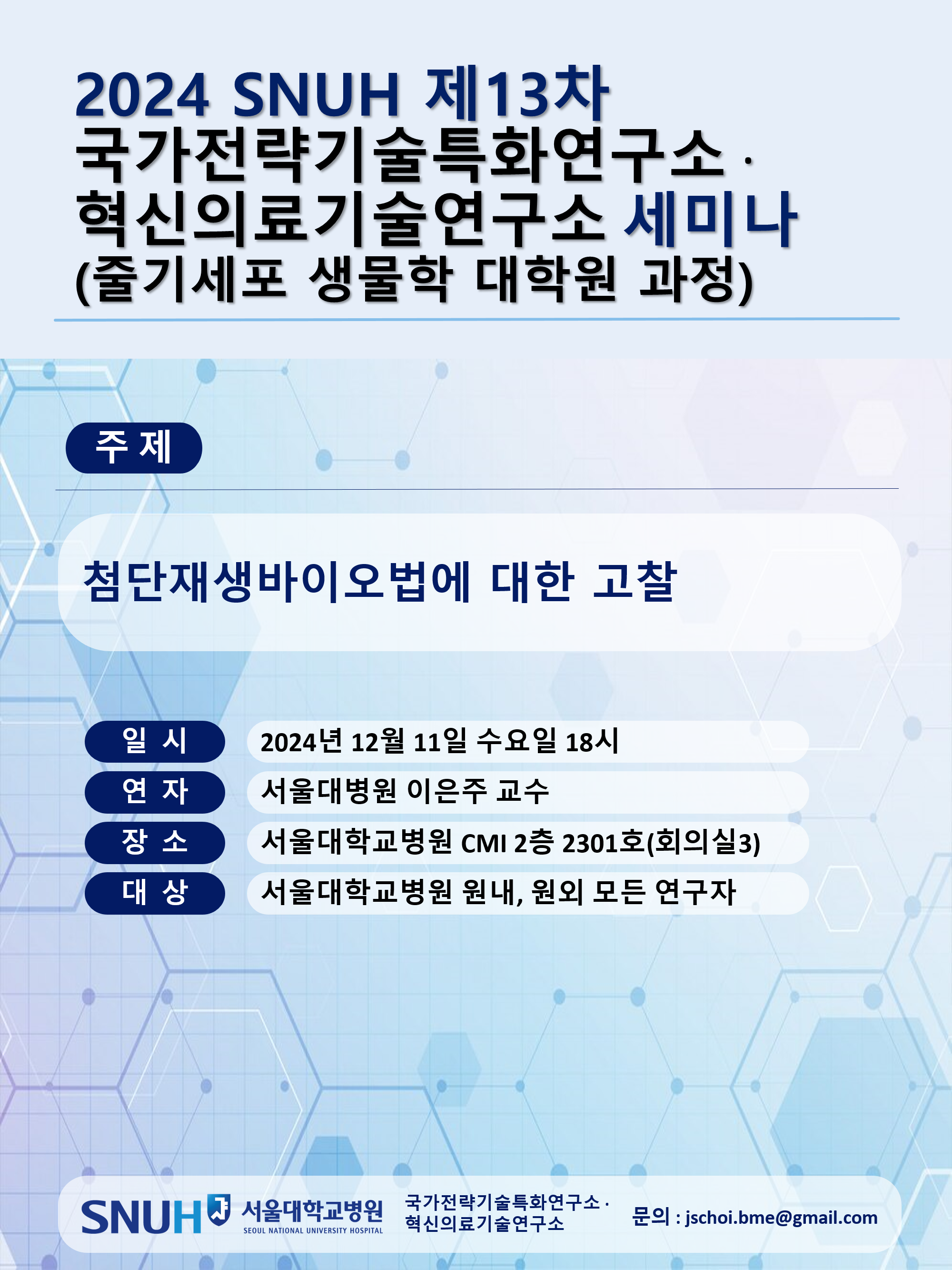 2024 제13차 SNUH 국가전략기술특화연구소-혁신의료기술연구소 세미나 일정을 다음과 같이 안내드립니다. - 주제: 첨단재생바이오법에 대한 고찰 - 연자: 서울대학교병원 이은주 교수 - 일시: 2024.12.11.(수) 18:00 - 장소: 서울대학교병원 CMI 2층 2301호(회의실3) - 대상: 원내/외 모든 연구자 - 문의: jschoi.bme@gmail.com |