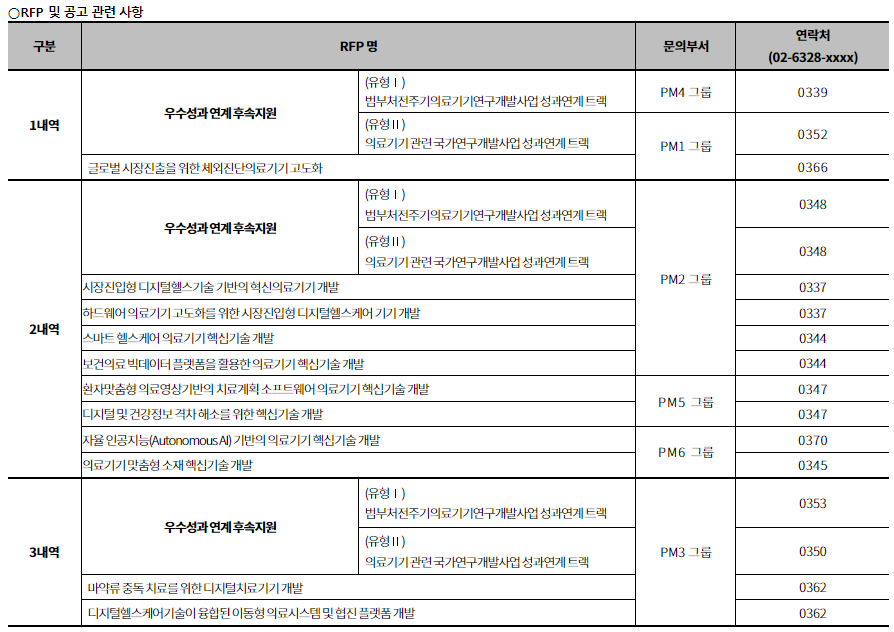 | 첨부파일 | (공고문)_2023년도_제2차_범부처전주기의료기기연구개발사업_신규지원_대상과제_공고문.pdf붙임1._2023년도_제2차_범부처전주기의료기기연구개발사업_신규지원_대상과제_과제제안요청서(RFP).pdf붙임2._2023년도_제2차_범부처전주기의료기기연구개발사업_신규지원_제출서류_목록.pdf붙임3._KMDF_범부처통합시스템_신규과제_접수_유의사항.pdf붙임4._KMDF_기술기여도_산정_가이드라인(참고).pdf | ||||||||